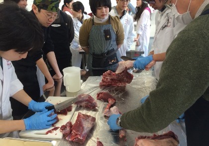 動物科学科3年次選択科目「野生動物学」では、現代の日本農村においてシカやイノシシなどの野生動物による農業被害が深刻化している現状について学 びました。また講義の中で、被害防止のため捕獲した鳥獣の、食肉等としての利活用についても学び、実際に捕獲されたイノシシを使った「ジビエ」料理を体験しました。今回は、 伊豆市の修善寺地区で捕獲され、衛生検査に合格したイノシシのモモ肉を使用して鍋を作りました。枝肉の解体・精肉から調理までをすべて自分たちの手で行 い、実際に試食する中で、ジビエに対する印象が大きく変化しました。