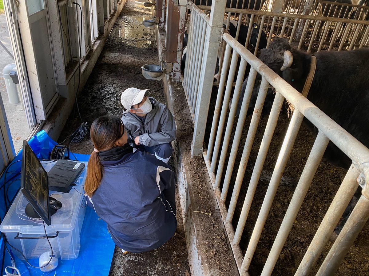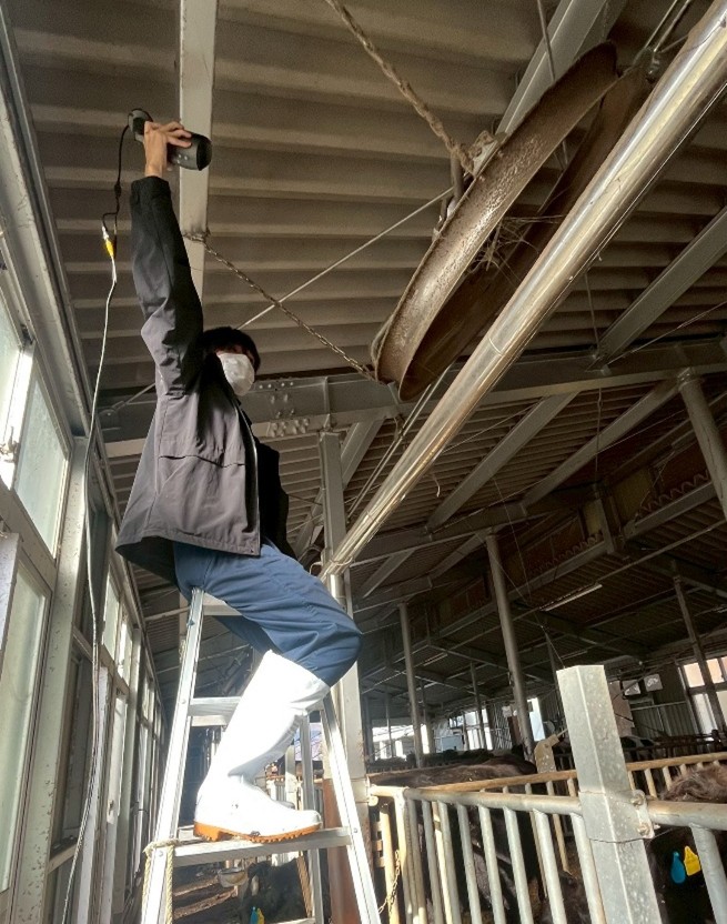 11月23日にはアニマルファームに行き、卒業研究用にカメラの設置をしてきました。どこにどのようにカメラを設置するべきか、自分たちが調べた先行研究を踏まえカメラの画角を確認しながら考えました。カメラの画角としてはベストだけど、牛舎の構造的に設置できない部分があり、全員が納得する位置を見つけるのに苦労しましたが、無事設置することができました。