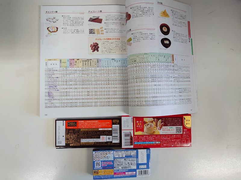 ▲日本食品標準成分表のミルクチョコレートのページと市販品の栄養成分表示(パッケージ裏面)の一例