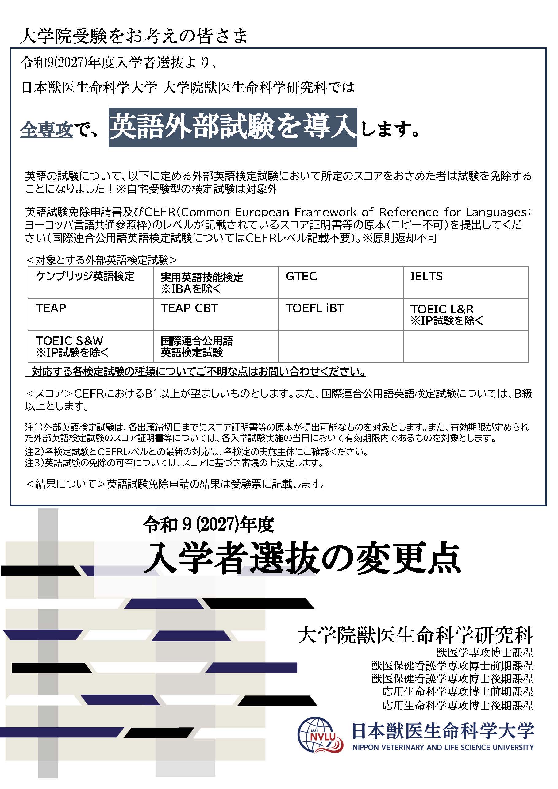 【大学院 入試変更点】令和9(2027)年度入学者選抜より大学院獣医生命科学研究科では、全専攻で英語外部試験を導入します。