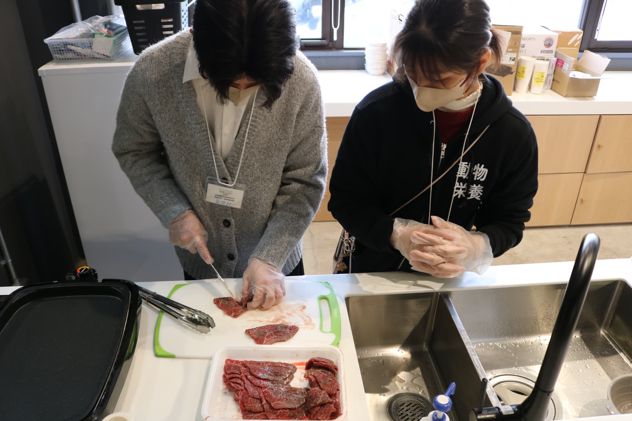 動物栄養学教室は、「”もったいない”を原点に和牛生産へのチャレンジ」をテーマに、研究内容の紹介と本学付属牧場 富士アニマルファームで育てた牛肉の試食を実施しました。