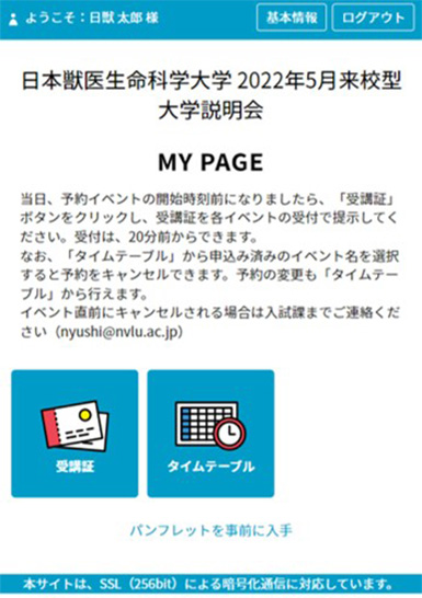 予約完了後、ご登録いただいたメールアドレスに申し込み完了メールをお送りいたしますので、申し込み内容についてご確認ください。メールアドレスの入力間違いがありますと、手続き完了メールが届きません。間違いのないようご入力ください。その後、当日のお時間になりましたらマイページよりログインしていただき各イベントに参加してください。