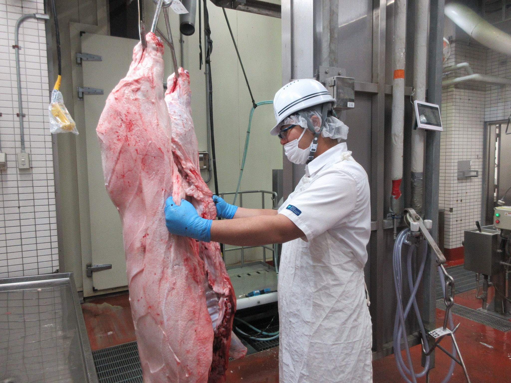 私は現在、東京都芝浦食肉衛生検査所でと畜検査をしています。と畜検査とは生きている牛や豚などの家畜を食用にするために病気などがないかを見つける検査のことで、この検査は獣医師であると畜検査員によってのみ行われています。私は豚の検査を担当しており、1頭毎に生体検査、解体前検査、解体後検査を実施しています。生体検査は、目で見る望診、手で触れて行う触診、必要に応じて聴診器や体温計等の器具を用いて行う聴診や打診、検温等の方法により、豚に異常がないかどうかを検査しています。解体前検査は、望診と触診を行っています。解体後検査では、家畜の頭部及び枝肉、内臓をそれぞれ望診及び触診、各臓器等を切開して観察する望診を行っています。肉眼検査だけでは判断が難しい場合には、微生物検査、理化学検査、病理検査を行い、合格とするかどうか総合的に判断しています。