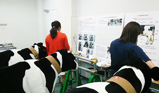 これまで本学は全国に先駆けてCBTトライアル、OSCEトライアルを実施しており、その過程で得た経験をもとに、vetOSCE 対策のためのスキルスラボを開設しています。スキルスラボでは試験前の練習として、牛を繋ぐためのロープワークや、犬の診察手順、聴診部位の確認、縫合の練習などを各種のシュミレーターを使って行うことができます。