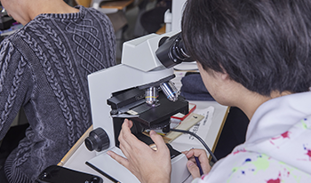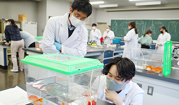 魚病学をより具体的に理解するために、魚類の解剖学、組織学、生理学、病理学および微生物学について行う実習です。ニジマスやキンギョなど、身近な魚を多く扱います。魚病の診断・治療に必須の基礎的知識および技術を修得します。