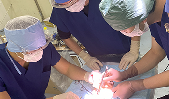 動物に対する外科的治療法を実施する上で必要な診断法および治療法に関する基本的手技を、生体、模型あるいは画像教材などで身につけます。本学動物医療センターで勤務している現役の獣医師による、実務経験にもとづく授業です。
